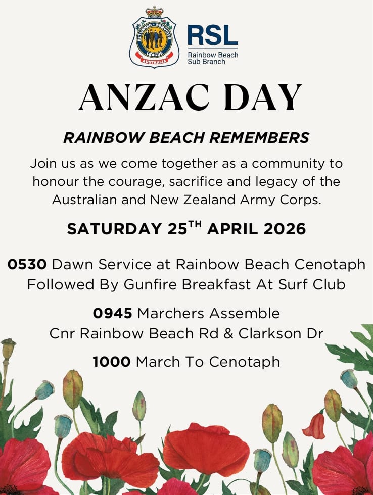 This ANZAC Day, join Rainbow Beach RSL Sub Branch in honouring the courage, sacrifice and mateship of all who have served.
